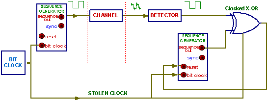 The receiver PRES generator (using a stolen bit clock in the example) is set to generate the same sequence as its counterpart at the transmitter. Its output is connected to the other input of the clocked X-OR gate. The clock ensures that the comparison is made at an appropriate instant within a bit clock period.