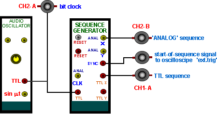 T1 Before inserting the SEQUENCE GENERATOR set the on-board DIP switch SW2 to generate a short sequence. Then patch up the model of Figure 2 above. Set the AUDIO OSCILLATOR, acting as the bit clock, to about 2 kHz. Set the oscilloscope sweep speed to suit; say about 1 ms/cm.