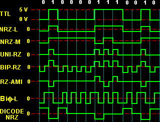 Biphase - level (Manchester): bipolar ±V volts. For each input '1' there is a transition from +V to -V in the middle of the bit-period. For each input '0' there is a transition from -V to +V in the middle of the bit period.