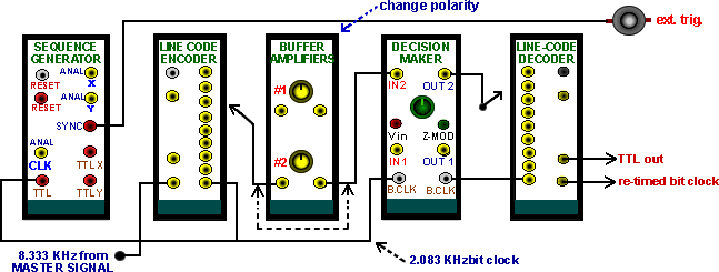The LINE-CODE ENCODER serves as a source of the system bit clock. It is driven by a master clock at 8.333 kHz (from the TIMS MASTER SIGNALS module). It divides this by a factor of four, in order to derive some necessary internal timing signals at a rate of 2.083 kHz. This then becomes a convenient source of a 2.083 kHz TTL signal for use as the system bit clock.