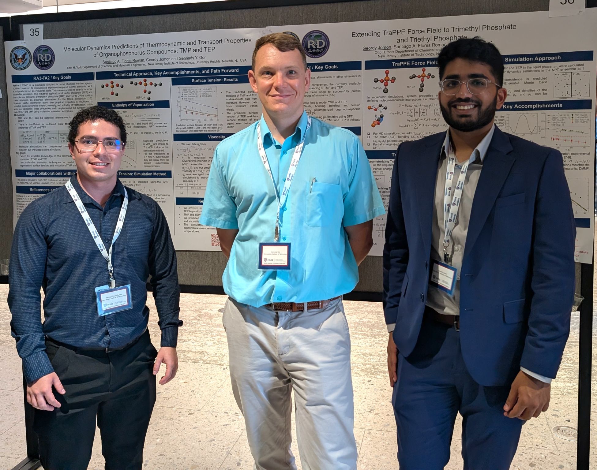 6/27/2025: Santiago, Geordy, and Gennady attended the 2025 MSEE Annual Review Meeting, in Washington DC. We presented our new results on force field parameterization and molecular simulations of organophosphates.